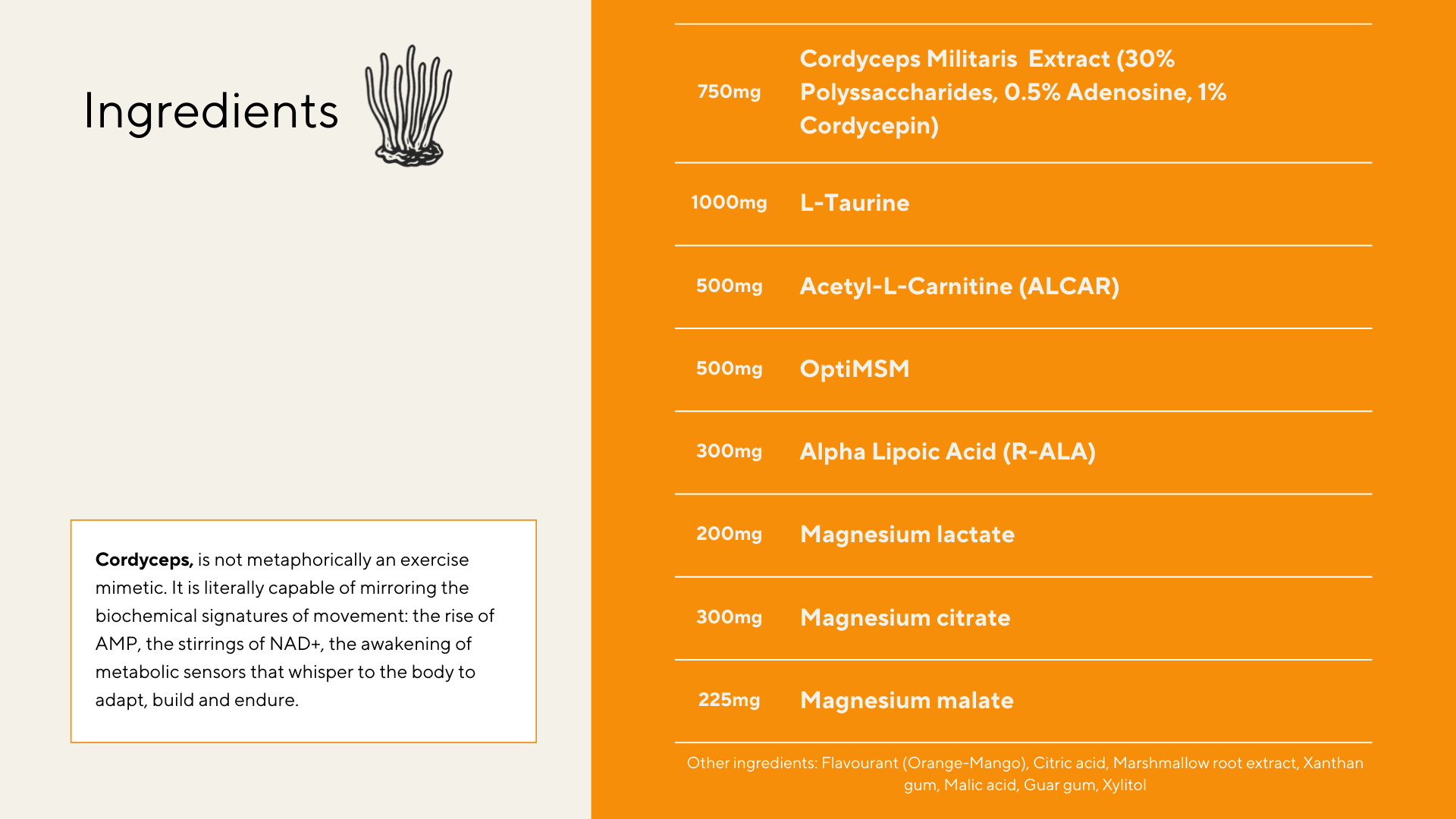- Standardised Cordyceps militaris extract (750 mg, delivering ~7.5 mg cordycepin per serving) supports cellular energy production in muscle, brain, and liver cells, enhancing endurance and metabolic performance.