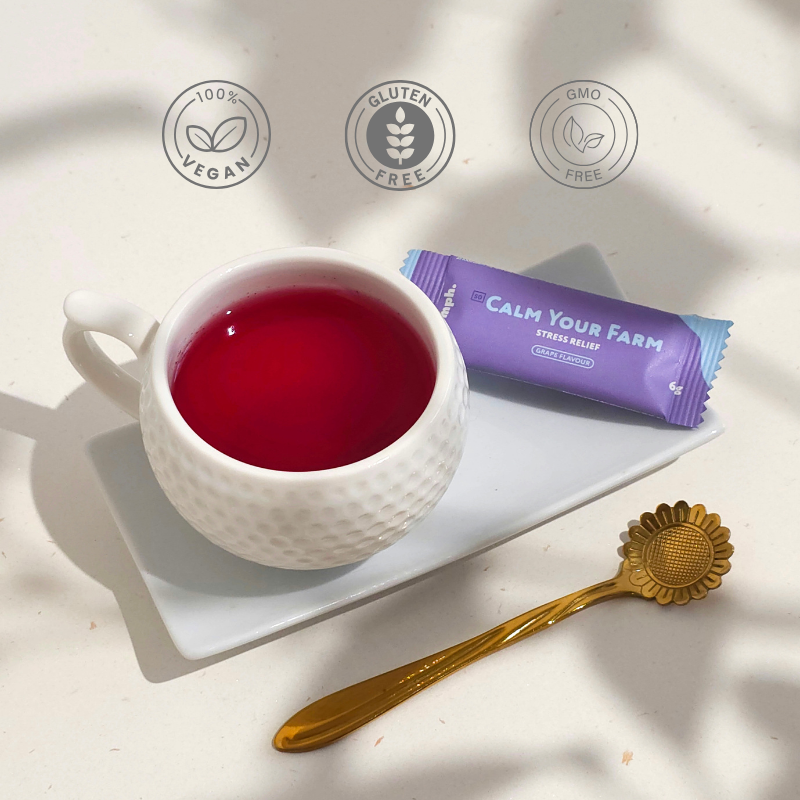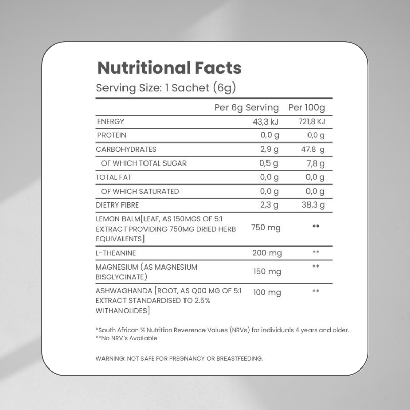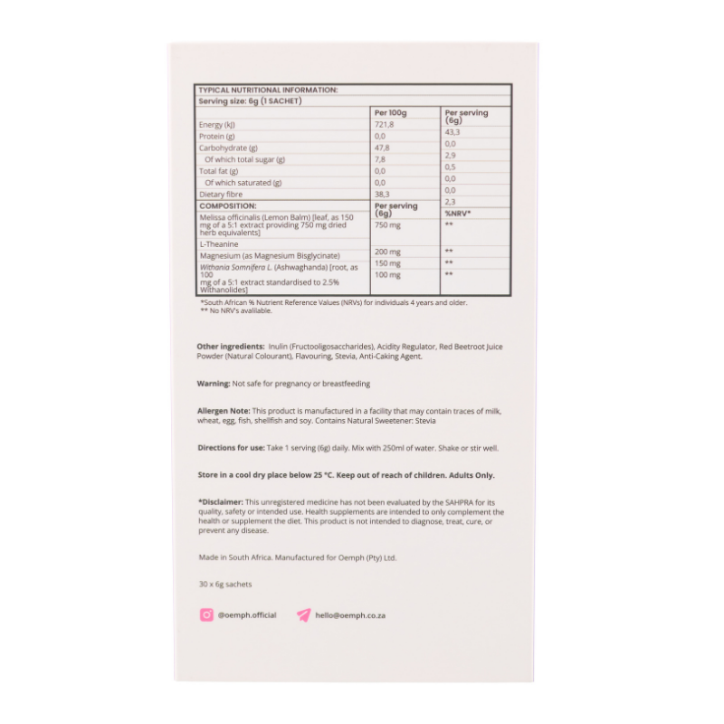 Ingredients: Melissa Officinalis (Lemon Balm); L-Theanine; Magnesium (as Magnesium Bisglycinate); Withania Somnifera (Ashwagandha), Inulin (Fructooligosaccharides),Acidity Regulator, Red Beetroot Juice Powder (Natural Colourant), Flavouring, Stevia, Anti-Caking Agent.